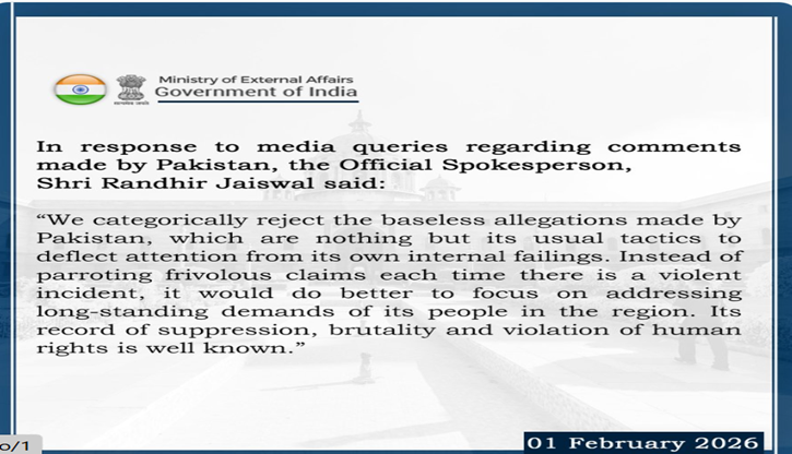 ভারতের পররাষ্ট্র মন্ত্রণালয় থেকে প্রকাশিত এক বিবৃতিতে পাকিস্তানের ভিত্তিহীন এ অভিযোগ অস্বীকার করাসহ বরং এ অঞ্চলের জনগণের বহুদিনের চাহিদা পূরণে দেশটিকে মনোযোগী হতে পরামর্শ দেওয়া হয়।